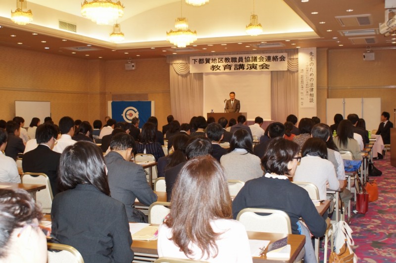 10月14日(土)、JAしもつけ ニューアプロニーを会場に下都賀連協教育講演会が開催された。 阪口勉法律事務所の阪口先生を講師にお迎えし、「先生のための法律相談~学校事故における教師の責任~」と題し、ご講演いただいた。会場は会員の皆様で満席となり、研修に励もうとする下都賀連協の意識の高さを感じた。阪口先生のご講演は、法律の基礎からわかる内容で、とても有意義な研修会となった。