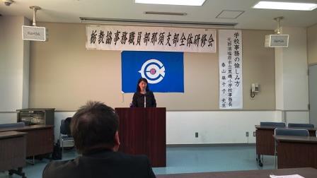 12月9日、大田原市ふれあいの丘にて、栃教協事務職員部那須支部全体研修会が開催された。研修会Ⅰでは、情勢報告、全日教連専門部要望報告、対県交渉の結果報告等を行った。研修会Ⅱでは、元那須塩原市立黒磯小学校事務長の春山麻千子氏に「学校事務の愉しみ方」と題し、ご講演をいただいた。春山氏の40年にわたる事務職員としての愉しみ方として、「先生方に喜んでもらえる教育環境を作る」、「教育環境を整える際には先生方と一緒に活動する」といったお話が大変印象的であった。事務職員の方ばかりでなく、同じ学校に勤務するものとして、みんなで協力して楽しい学校を作っていくことが大切であると強く感じたご講演であった。