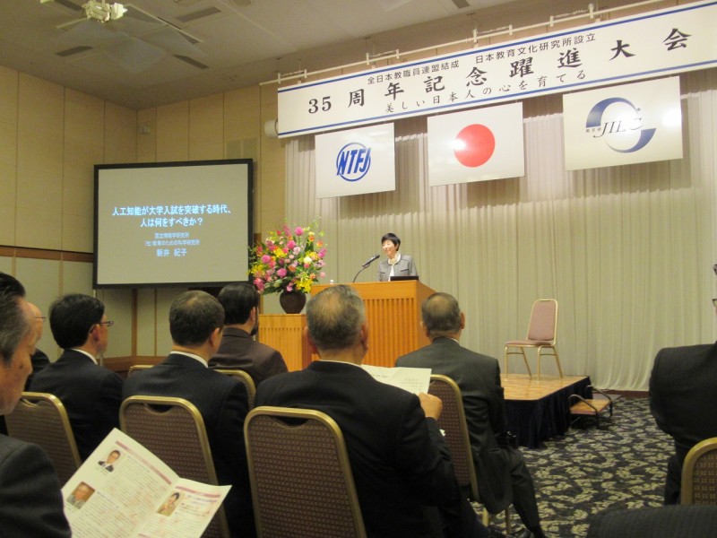2月23日(土)、東京都都市センターホテルにおいて「全日本教職員連盟結成・日本教育文化研究所設立35周年記念躍進大会」が盛大に開催された。ご来賓として、文部科学大臣柴山昌彦氏を始めとする多数の国会議員、また、教育関係者や歴代役員などにご臨席いただいた。栃教協からも18名が参加し、全国の全日教連加盟団体等代表者とともに35周年躍進大会をお祝いした。躍進大会後には、「人工知能が大学入試を突破する時代、人は何をすべきか?」と題して、国立情報学研究所教授の新井紀子氏による講演会が行われた。講師の新井氏は、「今後、人間が幸せに生きられるためのスキルとして、文章などの意味を正確に読む『読解力』が必要となってくる。中学を卒業するまでに、中学校の教科書を読めるようにすることが公教育の最重要課題である。」と熱く語っていた。