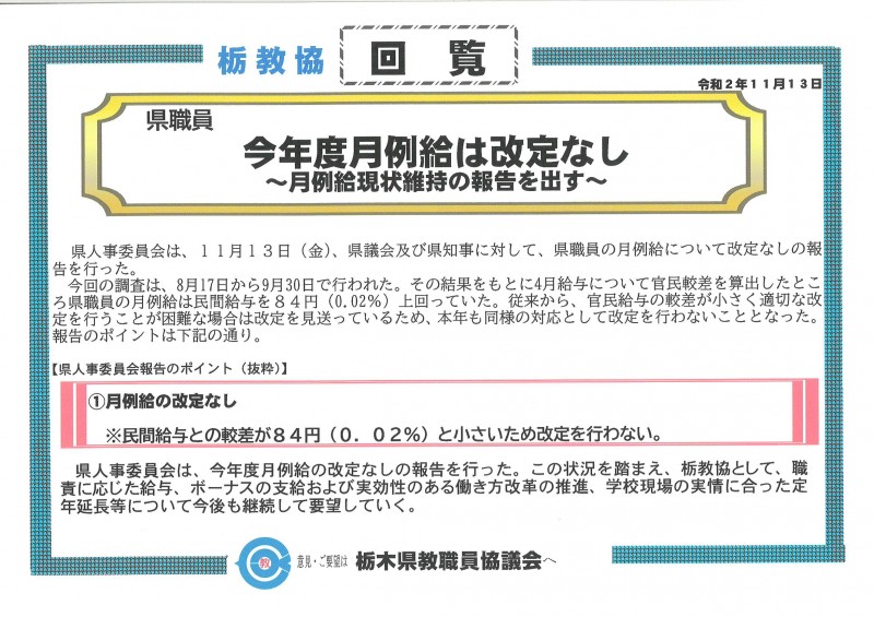 栃教協として教育専門職としてふさわしい給与額が支払われるよう今後も、学校の現状を訴え続け、要望を続けていく。