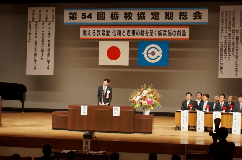 5月21日(土)、宇都宮市の教育会館大ホールにおいて、第54回栃教協定期総会を開催した。本会代議員262名の出席の下、 【平成二十七年度の経過報告並びに活動の概要】【平成二十七年度一般会計決算承認に関する件】【平成二十八年度運動方針に関する件】【平成二十八年度一般会計予算承認に関する件】【宣言採択に関する件】などが慎重に審議され、すべての議事が承認された。