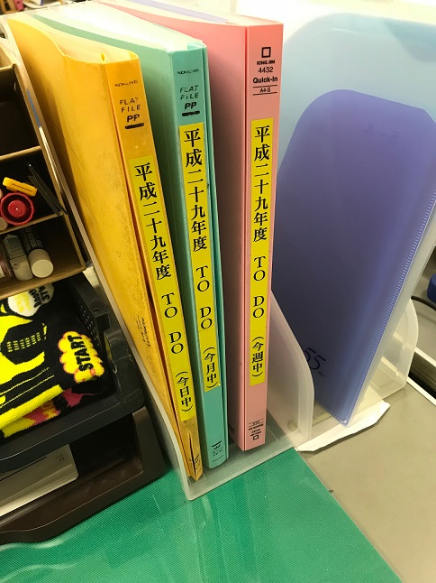 進行中のタスクについては、それぞれ別々のファイルに綴じ込むのではなく、大きく、「今日中」「今週中」「今月中」というファイルを準備し、その中に、クリアファイル管理された文書を入れておく。その日のうちに、「今日中」のタスクを処理し、退勤前に「今週中」の中から翌日処理すべき物を「今日中」ファイルへ移動、「今月中」の中から今週処理すべきものを「今週中」に移動し、退勤する。翌日は、「今日中」に入ったタスクを処理していく…という流れで仕事を処理する。